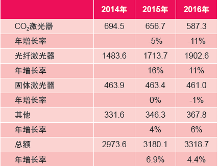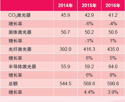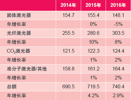 表6:材料加工領(lǐng)域的銷售收入(貨幣單位:百萬美元)     其他類別的銷售收入增長來自表面處理應(yīng)用,主要是熱處理和激光熔覆工藝,用于切割厚的碳纖維增強復(fù)合材料(CFRP)的高功率CO2激光器也擴大了使用。     在表7中,高功率光纖激光器增長了22%,這主要是由于它們進一步滲透到長期以來由高功率CO2激光器把持的市場。事實上,2014年可能是CO2激光器在此類別中的頂峰,之后新的8kW光纖激光器侵入了CO2激光器在該市場的最后立足點。增長的數(shù)字也反映了這一結(jié)果,光纖激光器是22%,而CO2激光器是-7%。在金屬切割加工領(lǐng)域,光纖激光器切割具有CO2激光器所有的優(yōu)點,同時還具有其他的優(yōu)勢,例如電效率、緊湊、便于維護、降低的運營成本和延長的維修周期,其銷售價格也很有競爭力。到2015年年底,光纖激光器在激光金屬切割銷售額中所占比例估計已上升到60%或更多。     在金屬厚板市場,CO2激光器還保留著一席之地,例如對于厚度超過1.0英寸的厚板單道自熔對接焊,原始功率是關(guān)鍵。此外,這些輸出功率在千瓦范圍內(nèi)的激光器非常適合非金屬的切割,例如復(fù)合材料和亞克力等。固體激光器的銷售收入減少得更多,不過德國通快公司的高功率碟片激光器所提供的激光強度在汽車行業(yè)的切割和焊接應(yīng)用中備受推崇。高功率(>1kW)的半導(dǎo)體激光器在激光釬焊和某些熱傳導(dǎo)焊接工藝中有著優(yōu)勢,特別是在汽車行業(yè)它們有著諸多優(yōu)點,例如電效率高、緊湊以及與許多在生產(chǎn)中使用的材料的兼容性。2015年在國際展會上推出了輸出功率超過2kW的高亮度、高功率直接半導(dǎo)體激光器, 至少有兩個系統(tǒng)集成商——Mazak Optonics和Panasonic Factory Solutions展出了這樣的系統(tǒng),使用的是由TeraDiode提供的千瓦級直接二極管激光器,用于切割和焊接應(yīng)用。這種激光類型可以在相同功率水平下替代光纖激光器,預(yù)計將在2016年拓展至金屬鈑金切割行業(yè)的應(yīng)用。 預(yù)測     盡管從全球制造業(yè)收到了許多不太利好的消息,但是全球工業(yè)激光器行業(yè)仍然繼續(xù)給我們帶來積極的消息。我們將其歸功于光纖激光器,這也是該行業(yè)的領(lǐng)導(dǎo)者IPG Photonics的第二十次連勝。大部分的其他供應(yīng)商也在2015年獲得了溫和的增長。工業(yè)激光器行業(yè)將在2016年再次戰(zhàn)勝所有來自全球制造業(yè)的負面消息,預(yù)計將獲得和2015年類似的表現(xiàn)。對此,我們將如何解釋?     美國LaserFocus World(LFW)雜志和Strategies Unlimited的同事也在努力解釋對工業(yè)激光持樂觀態(tài)度所帶來的不同步。所以,在這里我們引用LFW一月刊的一篇報道:“光纖激光器和3D打印技術(shù)在全球的成功絕不是異,F(xiàn)象。它們僅僅是激光技術(shù)獲得勝利的眾多例子中的兩個,在任何經(jīng)濟環(huán)境下,不管是工業(yè)化國家還是新興經(jīng)濟體,通過提高投資回報率和生產(chǎn)效率,都可以擊敗不景氣的環(huán)境!