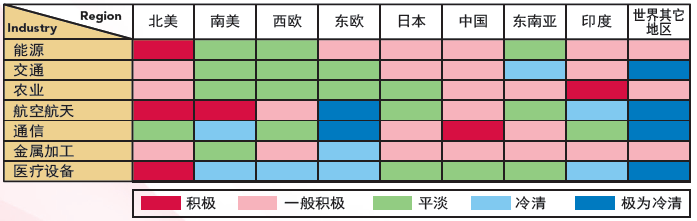 表8:2016年全球市場分析         我們將重點放在工業(yè)激光材料加工上,因為激光加工相關(guān)的許多應(yīng)用都集中在一些選定的行業(yè),盡管全球經(jīng)濟環(huán)境不理想,但是在技術(shù)上的投資可以加強他們在競爭激烈的全球市場的地位,從而能為其將來的發(fā)展積蓄力量。     表8是ILS對工業(yè)激光加工市場的機遇的總結(jié)。這張圖表總結(jié)了工業(yè)激光器在全球市場的發(fā)展機遇,主要是基于已發(fā)布的關(guān)鍵行業(yè)的銷售報表和訂單庫存。本報告中呈現(xiàn)的表格已是最新版本,并已考慮了上述提及的全球經(jīng)濟情況。簡單來說,我們應(yīng)該在所有紅色、粉紅色的領(lǐng)域加強表現(xiàn),同時也要關(guān)注綠色部分。北美和亞洲(日本、中國、東南亞和印度)是活躍的制造業(yè)市場,在這些地區(qū),能源、交通、航空航天和金屬零件加工等市場還比較積極,或者至少是一般積極。     回到表1來看,工業(yè)激光系統(tǒng)供應(yīng)商已經(jīng)有了足夠的積累以及高利潤率的訂單來維持與2015年旗鼓相當?shù)臉I(yè)務(wù)表現(xiàn)。過了2016年上半年以后又是另一回事了,ILS持謹慎的樂觀態(tài)度,并且預(yù)計會重復(fù)2015年下半年的銷售表現(xiàn),2016年全年的增長率將會略低(4.4%)。    光纖激光器的銷售將會強勁增長,抵消CO2激光器和固體激光器的跌幅,半導(dǎo)體和準分子激光器的銷售也會增加。    截至本報告發(fā)布,全球局勢仍然保持穩(wěn)定,所以工業(yè)激光器行業(yè)在2016年應(yīng)該會重演2015年的表現(xiàn)。來源:榮格 |