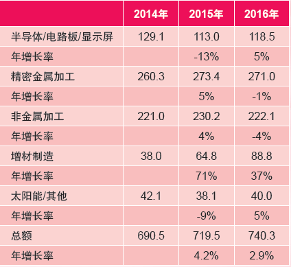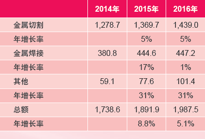 表5:用于材料微加工市場的激光器銷售收入(貨幣單位:百萬美元)     工業(yè)激光器微加工領(lǐng)域主要使用脈沖和連續(xù)波(CW)固體激光器、CO2激光器、光纖激光器和一些準分子和半導(dǎo)體激光器。這些激光器的平均輸出功率大部分主要在50-100W的范圍內(nèi)。不過在一些高端應(yīng)用中,它們可以實現(xiàn)更高的功率級別以獲得符合要求的生產(chǎn)率。在固體激光器類別中,主要是產(chǎn)生兆瓦峰值功率的低功率碟片激光器和超快激光器。 材料加工占主要地位     2015年的銷售收入有60%主要來自輸出功率超過1kW(平均功率)的工業(yè)激光器。在這一領(lǐng)域中主要是由金屬切割貢獻的,具體來說是指金屬制品行業(yè)中的金屬鈑金切割。據(jù)估計,在2015年,全球范圍內(nèi)超過13億美元的高功率激光器是來自金屬切割系統(tǒng)的安裝。由于在任何發(fā)達國家或發(fā)展中國家,金屬加工都是基礎(chǔ)產(chǎn)業(yè),其每年的增長都對這些國家的國民生產(chǎn)總值(GNP)的增長起著重要影響,因此,表6和表7中預(yù)測的個位數(shù)增長是基于全球經(jīng)濟的形勢。發(fā)達國家的制造業(yè)增長約為7%,新興國家約為3%。一般來說,金屬加工業(yè)具有中高位的個位數(shù)增長,激光金屬切割遵循了這一趨勢。     隨著全球汽車行業(yè)在2015年初的復(fù)起(盡管中國、俄羅斯、南美和東南亞地區(qū)的增長放緩),激光焊接獲得了急劇的增加。北美地區(qū)小型SUVs和輕型卡車市場的火熱,以及歐洲汽車銷售的復(fù)蘇,都起到了作用。由于汽車制造商青睞只能用激光焊接的高強度鋼和需要高要求外觀的車身設(shè)計,激光焊接/激光釬焊重振旗鼓。因此,激光器在焊接領(lǐng)域獲得了17%的增長(表6)。對2016年的預(yù)測就不是很樂觀,大眾汽車丑聞造成的銷售下降可能會讓這個領(lǐng)域只有很低的個位數(shù)增長。