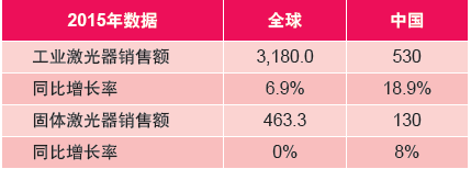 據(jù)Unlimited Strategy的報告顯示,全球工業(yè)級激光器在2015年的銷售總額達到31.8億美元,比2014年增長了6.9%(表1)。在全球經(jīng)濟持續(xù)放緩,特別是主要新興市場表現(xiàn)疲軟,西方經(jīng)濟體情況不樂觀的情況下,全球工業(yè)激光能逆轉(zhuǎn)制造業(yè)的頹勢,實現(xiàn)正增長。其中,固體激光器在2015年的銷售額為4.63億美元,與2014年基本持平,預(yù)測未來固體激光器將穩(wěn)步持續(xù)提高。