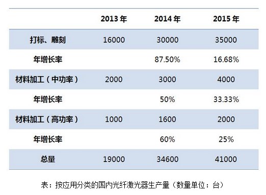 打標(biāo) / 雕刻市場進(jìn)入溫和增長階段 中國進(jìn)入光纖激光市場起步晚,發(fā)展快,直接表現(xiàn)在打標(biāo)/雕刻領(lǐng)域,因激光器的可持續(xù)性和實(shí)用性等優(yōu)勢,2013-2014年國內(nèi)激光打標(biāo)技術(shù)取代傳統(tǒng)的標(biāo)識技術(shù)的條件相對成熟,2014年打標(biāo)/雕刻市場產(chǎn)量相比2013年實(shí)現(xiàn)87%的增長,而在歷經(jīng)兩年爆發(fā)式增長后,國內(nèi)光纖激光器市場生態(tài)環(huán)境逐漸穩(wěn)定,2015年打標(biāo)/雕刻市場進(jìn)入增長放緩階段。 中功率材料加工市場將保持穩(wěn)健增長 在產(chǎn)量上,2014年中功率材料市場相較2013年增長50%,2013-2014年是激光市場格局基本成型時期,因2015年受世界主要經(jīng)濟(jì)體需求影響,工業(yè)市場熱度下降,因此中功率市場增長速度有一定回落,但仍保持33%左右的增長。下游設(shè)備加工應(yīng)用需求迫切,電子、航空、通訊、信息處理等制造領(lǐng)域應(yīng)用深入,中高功率光纖器將成為國內(nèi)光纖市場的未來發(fā)展趨勢。 高功率材料加工市場發(fā)展空間較大 2013年-2015年期間,高功率材料加工市場在產(chǎn)量值上已實(shí)現(xiàn)翻倍增長,從2013年增至1000臺增至2015年的2000臺。先進(jìn)激光制造技術(shù)的主要發(fā)展方向是高功率、高光束質(zhì)量、高智能化等,這一發(fā)展方向已成為國內(nèi)外業(yè)界的發(fā)展共識,未來光纖激光器市場份額將以高功率材料加工領(lǐng)域?yàn)橹饕鲩L來源。