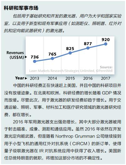 科研和軍事市場 盡管 2016 年全球研發(fā)資金預(yù)測報告稱,美國的研發(fā)經(jīng)費將增加 3.4%至 5140 億美元,但是特朗普當(dāng)選美國總統(tǒng)后卻有文章稱 :“特朗普當(dāng)選將威脅美國科學(xué)”,文章詳細(xì)介紹了新的管理層已經(jīng)將氣候變化視為一種騙局,并將不顧可再生能源倡議,支持礦石燃料工業(yè)。 讓人們看到希望的是,政府機關(guān)彼此之間的制衡將有利于科學(xué)(和激光器)的發(fā)展。在一份 MSN 新聞簡報中,特朗普似乎已經(jīng)“對巴黎氣候協(xié)議沒有那么不滿了”。 《自然》雜志于 2014 年刊登的一篇文章指出,到2020 年,中國有望在科研經(jīng)費支出方面超過美國。2016 年6 月《自然》刊登的一篇題為“通過數(shù)字看中國(China by the Numbers)”的新聞故事中,作者 Richard Van Noorden寫道,現(xiàn)在中國將超過 2%的 GDP 投資到研發(fā)上,該比例甚至超過了歐盟,并指出許多“世界上最好的”科學(xué)成就都在中國,包括從北京到上海的世界上最長的實驗量子通信網(wǎng)絡(luò),并且中國發(fā)表的研究論文數(shù)量也大幅增加。 2016 年,激光器在研發(fā)市場獲得的銷售額,約占2016 年全球研發(fā)支出的 3.5%,比 2015 年溫和增長 4.2%,達(dá)到 4.714 億美元。NKT Photonics 公司在 2016 年初以大 2900 萬美元收購了 Fianium 公司,以加強其在用于科學(xué)和計量市場的超快光纖激光器和超連續(xù)光譜激光器領(lǐng)域的市場地位。NKT Photonics 認(rèn)為研發(fā)市場會繼續(xù)表現(xiàn)強勁(或至少是穩(wěn)步緩慢增長)以鞏固未來的銷售業(yè)績。相比之下,軍事市場則為激光器提供了一個更光明的未來。