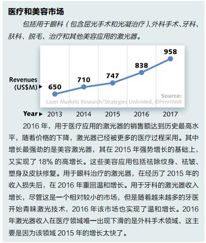 醫(yī)療和美容市場 2016 年是美容激光器銷售非常好的一年。科醫(yī)人公司(Lumenis,自稱是世界上最大的激光醫(yī)療設(shè)備公司,主要用于手術(shù)、美容和眼科應(yīng)用)2014 年第二季度實現(xiàn)了連續(xù)第八個季度的同比業(yè)績增長,該季度銷售額同比增長 9.3%,達(dá)到 7250 萬美元。但是,科醫(yī)人公司于 2015年被全球投資公司 XIO 集團(tuán)以 5.1 億美元收購,現(xiàn)在其財務(wù)透明似乎不復(fù)存在。 科醫(yī)人能提供治療泌尿病癥的脈沖鈥激光器系列、治療干眼和紅斑痤瘡的強脈沖光(IPL)技術(shù)、用于中耳手術(shù)的 OtoLase 技術(shù),以及用于皮膚科和耳鼻喉科的點陣式 CO2 激光器,其產(chǎn)品似乎覆蓋了所有醫(yī)療應(yīng)用。此外,科醫(yī)人用于經(jīng)口激光顯微手術(shù)(TLM)的 AcuPulse DUOCO2 激光器,活躍在早期氣道癌癥治療的第一線,比放化療具有優(yōu)異的治愈率。 Cynosure 公司提供的產(chǎn)品幾乎與科醫(yī)人相同(除了CO2 激光產(chǎn)品),該公司 2016 年第三季度的收入飆升至1.064 億美元,比 2015 年同期增長高達(dá) 36%。同樣,Cutera 公司 2016 年第三季度的收入也比 2015 年同期增長31%,達(dá)到 3030 萬美元。 僅憑強勁增長的美容激光器的銷售業(yè)績,我們預(yù)測2017 年激光器在醫(yī)療和美容市場的銷售額將從 8380 萬美元增長到 9580 萬美元,增長幅度高達(dá) 14.3%。如果 LISA Laser USA 等公司能成功地將其 RevoLix 激光產(chǎn)品整合到機器人輔助的 da Vinci 手術(shù)系統(tǒng)中,預(yù)計 2017 年后,該市場可能會出現(xiàn)更迅猛的增長。