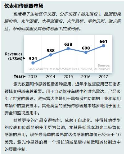 儀器儀表和傳感器市場 激光雷達(dá)技術(shù)獲得的不可否認(rèn)的成功、以及圍繞該技術(shù)引發(fā)的并購浪潮,無疑是 2016 年儀器儀表和傳感器領(lǐng)域的一大熱點故事。與此同時,基于激光的結(jié)構(gòu)健康監(jiān)測,對于飛機、車輛、橋梁、鐵路、道路和任何關(guān)鍵運輸和基礎(chǔ)設(shè)施資產(chǎn)而言,正在變得越來越重要。 2016 年 8 月,美國海軍研究實驗室(NRL)的科學(xué)家使用分布反饋光纖激光 - 聲發(fā)射傳感器,成功地檢測了從鉚接搭接接頭中的裂紋產(chǎn)生的聲發(fā)射。其原位能力超過壓電技術(shù),可以與現(xiàn)有的光纖應(yīng)力和溫度傳感系統(tǒng)結(jié)合或“多路復(fù)用”。 加拿大 Opsens 公司以生產(chǎn)用于井下石油和天然氣監(jiān)測的光纖傳感系統(tǒng)而聞名,該公司正在人體內(nèi)進(jìn)行結(jié)構(gòu)健康監(jiān)測項目。其獲得 FDA 批準(zhǔn)的 OptoWire II 光纖傳感器,是一種光導(dǎo)絲,能夠測量血流儲備分?jǐn)?shù)(FFR),進(jìn)而能夠診斷心臟病患者的冠狀動脈狹窄的嚴(yán)重程度。截至 2016 年 8 月 31 日結(jié)束的 2016 財年,Opsens 公司的FFR 銷售額增長了十倍(從 2015 財年的 50 萬美元增加到2016 財年的 520 萬美元),2016 財年的總銷售額達(dá) 960 萬美元。 基于太赫茲激光的儀器也正在獲得商業(yè)上的認(rèn)可。據(jù)報道,英國 TeraView 公司 2016 年的銷售額翻了一番,業(yè)績增長的驅(qū)動力主要來自其 TeraPulse 太赫茲成像儀和光譜儀,以及其用于半導(dǎo)體封裝檢測的電光太赫茲脈沖反射系統(tǒng) EOTPR 5000 的成功推出。在截至 2016 年 9 月30 日的 9 個月期間,太赫茲和光纖傳感系統(tǒng)制造商 Luna Innovations 公司的銷售額從 2015 年同期的 2860 萬美元增長到 4330 萬美元,這主要得益于市場對其用于測量復(fù)合材料應(yīng)力的 ODiSI 系統(tǒng)的需求增加。