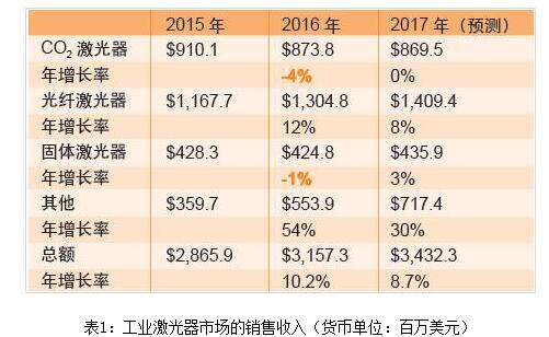 過去的2016年,大多數(shù)世界經(jīng)濟(jì)體的國內(nèi)生產(chǎn)總值(GDP)均呈現(xiàn)下降走勢,導(dǎo)致全球制造業(yè)進(jìn)入不穩(wěn)定的時期。除了制造業(yè)正常的波動周期外,去年發(fā)生了若干影響制造業(yè)經(jīng)濟(jì)的因素。例如,全球化陷入僵局、富裕經(jīng)濟(jì)體的外國直接投資從高峰驟降40%、國際貸款在過去兩年內(nèi)下降了9%——這關(guān)系到國際貨幣基金組織和世界銀行,因為許多國家的發(fā)展趨向內(nèi)斂化,從而可能進(jìn)一步加劇全球制造業(yè)的低迷形勢,尤其是在美國——當(dāng)總統(tǒng)大選結(jié)果傳遞出一個“保護(hù)主義”的訊息的情況下更是如此。世界貿(mào)易組織將全球貿(mào)易量增長率大幅削減至1.7%,導(dǎo)致負(fù)面跡象出現(xiàn),例如集裝箱吞吐量在經(jīng)過長達(dá)四十年的兩位數(shù)擴(kuò)張后下降了4%。 伴隨英國退歐、世界各地的恐怖襲擊事件、中國推遲重組、跨太平洋伙伴關(guān)系協(xié)定(TPP) 再議以及美國總統(tǒng)選舉結(jié)果等一系列事件,全球制造業(yè)的經(jīng)濟(jì)增長前景持續(xù)呈疲軟態(tài)勢,繼而為各行各業(yè)的發(fā)展帶來了更高的不確定性。 傳統(tǒng)上看,工業(yè)激光器的收入一直與機(jī)床行業(yè)的增長曲線保持同步,直到2008-2009年全球經(jīng)濟(jì)衰退開始恢復(fù)。之后,在對高功率光纖激光鈑金切割機(jī)以及大量使用超快脈沖(UFP)固體激光器加工的智能手機(jī)組件強(qiáng)勁的購買需求的推動下,工業(yè)激光器行業(yè)迅速從經(jīng)濟(jì)衰退中復(fù)蘇過來,年收入也發(fā)生了實質(zhì)性增長。 過去兩年內(nèi),工業(yè)激光器市場的表現(xiàn)優(yōu)于機(jī)床部門,年收入實現(xiàn)了個位數(shù)的穩(wěn)定增長。本篇報告將再次顯示這一強(qiáng)勁的增長,這與全球機(jī)床行業(yè)報告的溫和增長背道而馳。有堅實的理由可支撐這一論斷:大功率光纖激光器的銷量實現(xiàn)兩位數(shù)的增長、使用準(zhǔn)分子激光器加工的新型智能手機(jī)顯示器激增、激光增材制造技術(shù)在飛機(jī)發(fā)動機(jī)部件中的應(yīng)用持續(xù)擴(kuò)張,以及超快脈沖激光器在激光微細(xì)加工中的使用顯著增長等等,這些都是典型例子。 工業(yè)激光器是自動化材料處理系統(tǒng)中的關(guān)鍵部件。隨著制造業(yè)越來趨向工業(yè)4.0,從集中式制造轉(zhuǎn)向分散式制造,生產(chǎn)方式因而需要自動適應(yīng)起伏多變的供應(yīng)鏈需求。如今,與互聯(lián)網(wǎng)連通的傳感器和計算機(jī)控制的最先進(jìn)的加工設(shè)備正得到廣泛應(yīng)用,而激光器,就其本身的性質(zhì)而言,將成為合適的能量源選擇方案。 激光器市場概述 2016年的市場報告在很大程度上受到激光微加工領(lǐng)域收入增長所帶來的積極影響。例如,使用多晶硅作為薄膜晶體管材料能夠制造出外觀更好、速度更快以及功率更低的有機(jī)發(fā)光二極管(OLED)顯示器。將非晶硅轉(zhuǎn)化為多晶形式的最有效方式是通過使用基于準(zhǔn)分子激光器的低溫多晶硅退火工藝。美國相干公司(位于加利福尼亞州的圣克拉拉)已經(jīng)收到大量使用其開發(fā)的準(zhǔn)分子激光器加工產(chǎn)品的訂單,交貨期甚至已排到了2018年。這些激光器的不少交貨任務(wù)已于2016年完成,由此推動了微加工部門實現(xiàn)了兩位數(shù)的收入增長。此外,在“其它”類別中,應(yīng)用于快速發(fā)展的增材制造領(lǐng)域的高功率激光器也實現(xiàn)了一定的增長率。 如表1所示:2016年,工業(yè)激光器市場的銷售總收入比2015年修正后的總收入增長10.2%。2016年收入增長率的明顯變化是CO2激光器的收入下降4%,反映出低功率產(chǎn)品的價格下跌,以及上文解釋到的因市場經(jīng)濟(jì)原因造成的用于鈑金切割的高功率CO2激光器的訂單量略有下滑。