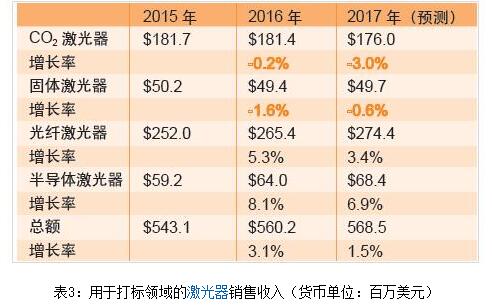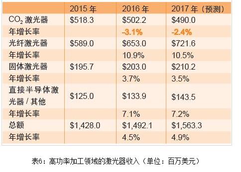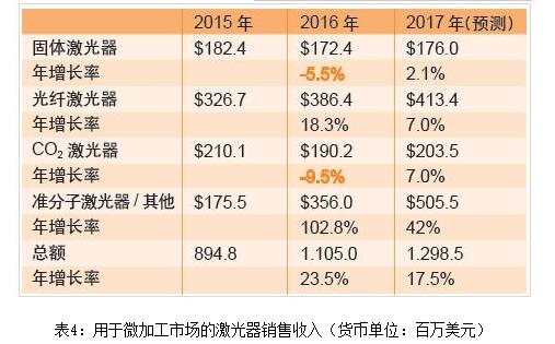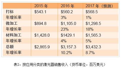 光纖激光器在2015 年努力實現(xiàn)了十億美元的水平,并且在2016年延續(xù)了強(qiáng)勁的雙位數(shù)增長。光纖激光器不斷侵蝕其他激光器的市場份額,特別是用于鈑金切割的大功率CO2激光器。在2016年下半年舉行的兩個規(guī)模最大的金屬加工展(德國的EuroBlech和美國的Fabtech)上,展出的數(shù)十臺高功率激光切割機(jī)中,只有一臺是由CO2激光器驅(qū)動的,而上一年,則有數(shù)臺大功率CO2激光切割機(jī)被展出。除了用戶切割非金屬材料的需求,與銷量激增的光纖激光器相比,售出的CO2激光切割機(jī)少之又少。如今,潛在的買家可以從全球60家供應(yīng)商處購買到輸出功率介于2kW 到12kW 的光纖激光平板切割機(jī)。在8kW到12kW的功率區(qū)間,光纖激光器的切割質(zhì)量能媲美CO2 激光器,但切割速度卻更快。 表2清晰顯示了2016年用于硅退火應(yīng)用的高功率準(zhǔn)分子激光器對微加工領(lǐng)域的收入造成的影響。同時,激光打標(biāo)應(yīng)用的收入有所下滑,因為競爭的加劇對產(chǎn)品的單位售價產(chǎn)生了壓力,而單位銷售持續(xù)強(qiáng)勁,這一趨勢在2017 也將保持不變。