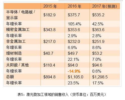 除去激光退火應(yīng)用的微加工在本報告中提及的三個工業(yè)激光板塊顯示出最快的增長速度。2016年,固態(tài)激光器的收入負(fù)增長是由于2015 年修訂后的數(shù)據(jù)而產(chǎn)生的偏差。該產(chǎn)業(yè)部門是由上百種為大量應(yīng)用領(lǐng)域服務(wù)的工業(yè)激光器所組成的,這些激光器合力擴(kuò)大了收入水平,但激光退火工藝缺少一種“絕殺”型應(yīng)用——例如鈑金切割能夠為高功率應(yīng)用所創(chuàng)造的收入。 2016年,光纖激光器的收入繼續(xù)取代CO2 激光器和長脈沖固態(tài)激光器,工藝開發(fā)師越來越多地使用新開發(fā)且展現(xiàn)出實質(zhì)性收入增長潛力的UV和2μm光纖激光器。 如果更深入地分析激光微加工工藝(表5),便會發(fā)現(xiàn)其對當(dāng)前和未來收入的影響是顯而易見的。顯示屏產(chǎn)品門類統(tǒng)計出來的105.4%的增長率是基于2016年季度報告的分析結(jié)果,顯示的是該年度準(zhǔn)分子激光退火系統(tǒng)的出貨量。由于該系列產(chǎn)品的出貨量在2017年和2018年會持續(xù)增加,它們將可能推動這一應(yīng)用市場的銷售份額。