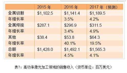 如表7顯示,金屬切削是高功率激光加工收入的增長驅(qū)動因素,特別是鈑金切割,2016年共售出超過7,000套相關(guān)的激光系統(tǒng)和激光器,占總收入的76%以上;而這一年,巴西等國家的固定設(shè)備投資卻明顯減少,不如預(yù)期。在這一經(jīng)濟(jì)放緩勢頭來襲后,中國的固定設(shè)備銷售額卻逆勢上揚(yáng),政府批準(zhǔn)的設(shè)備投資份額顯示出上升走勢?梢钥吹絹喼奕匀皇羌す忖k金切割的最大市場,共計38 家國內(nèi)及14家國際企業(yè)能夠提供光纖激光切割設(shè)備(系統(tǒng))。即便如此,金屬切削市場僅顯示出3.5%的適度增長。 加速的大功率激光焊接應(yīng)用,其中包括對石油管道的超高功率的光纖激光焊接,持續(xù)推動了高功率激光加工市場的發(fā)展。此外,大功率激光器在增材制造中也獲得了越來越多的用武之地,這是因為生產(chǎn)需求呼吁在一系列其它應(yīng)用,如熔覆和脫漆等工藝中使用功率更高的激光器。