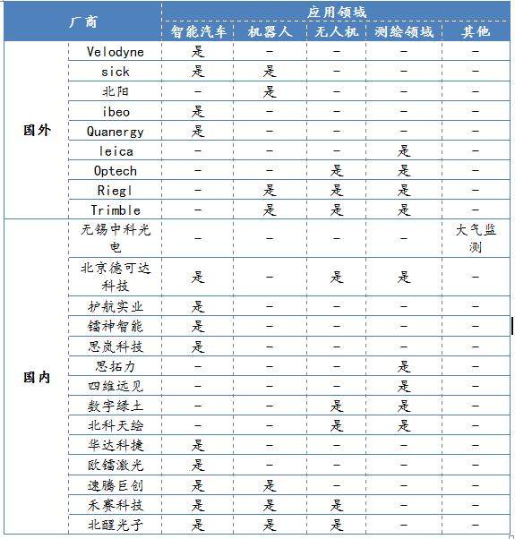 由于固態(tài)式激光雷達(dá),不具備旋轉(zhuǎn)組件,這在一定程度降低了硬件成本和磨損消耗,且在個(gè)別光束陣元損壞的前提下,固態(tài)式激光雷達(dá)整體仍可持續(xù)工作,在可靠性上實(shí)現(xiàn)了大大提升。 二、激光雷達(dá)的主要應(yīng)用領(lǐng)域 激光雷達(dá)的下游應(yīng)用領(lǐng)域核心是掃地機(jī)器人、AVG小車(chē)、汽車(chē)自動(dòng)駕駛、無(wú)人駕駛、空間測(cè)繪和無(wú)人機(jī)等領(lǐng)域。從目前全球激光雷達(dá)企業(yè)的下游應(yīng)用領(lǐng)域分布來(lái)看,居多的仍然是智能汽車(chē)和機(jī)器人領(lǐng)域。
