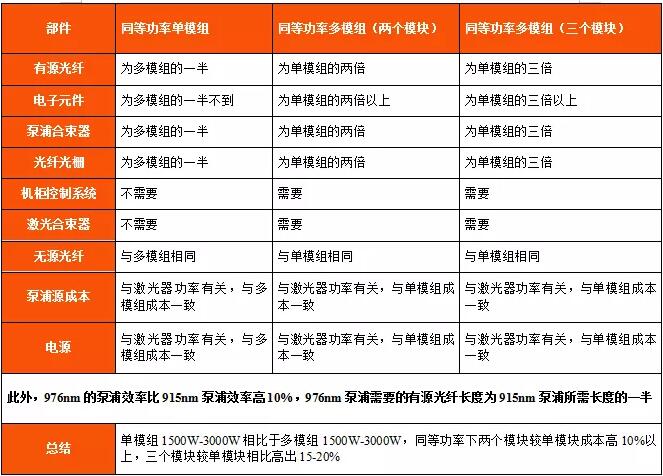 976nm單模塊相比于同功率915多模塊大大減少原材料使用。976nm泵浦技術(shù)路線可實現(xiàn)單模單腔3000W,元器件的成本降低較多,相比如多模塊的元器件使用對比如下: