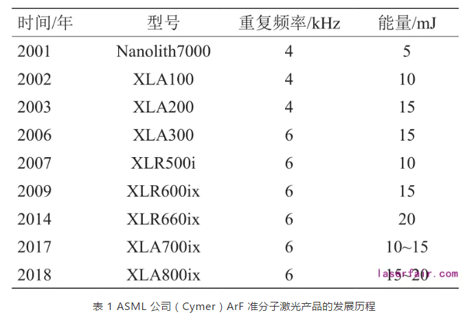 針對(duì)光刻應(yīng)用需求,國(guó)際上主要有荷蘭 ASML 公司(Cymer)和日本 Gigaphoton 公司提供相應(yīng)的準(zhǔn)分子激光產(chǎn)品,相應(yīng)功率從 10~100 W、光譜線寬從 0.5~0.1 pm、重復(fù)頻率從 2~6 kHz。高重復(fù)頻率可以提高加工產(chǎn)率,窄線寬可以保證芯片圖案的精細(xì)度,減小系統(tǒng)中色差影響,因此,高重頻和窄線寬是光刻用準(zhǔn)分子激光光源發(fā)展不斷追求的指標(biāo)。表 1 為 ASML 公司(Cymer)ArF 準(zhǔn)分子激光產(chǎn)品的發(fā)展歷程。