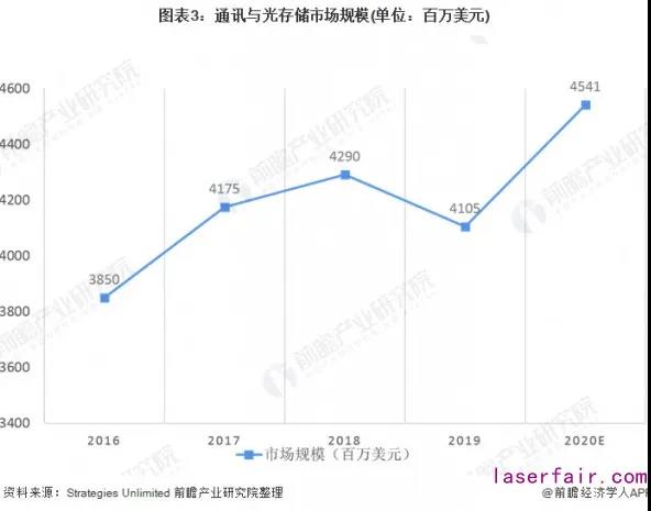 根據(jù)Strategies Unlimited的數(shù)據(jù),2019年通訊與光存儲市場規(guī)模為4105百萬美元,同比下降4.3%。通信市場的激光器收入受到行業(yè)周期的影響,幾乎與全球范圍內(nèi)新的、大規(guī)模的通信網(wǎng)絡(luò)部署同步。2017年和2018年,大多數(shù)4G蜂窩網(wǎng)絡(luò)的部署已經(jīng)完成,5G網(wǎng)絡(luò)剛剛開始部署,需求并未完全釋放,隨著2020年5G網(wǎng)絡(luò)的逐步開展,需求將得到釋放,通訊市場的規(guī)模預(yù)計(jì)將有所回升。