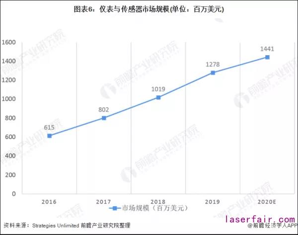 2019年儀表與傳感器市場規(guī)模為1441百萬美元,同比增長12.75%,儀表與傳感器在激光市場中雖應(yīng)用范圍不是很大,但卻具有比較好的增長潛力,其細(xì)分市場具有較多正在快速增長的領(lǐng)域,如激光雷達(dá)、垂直腔面發(fā)射激光器(VCSEL)、邊緣發(fā)射激光二極管和3D 傳感。