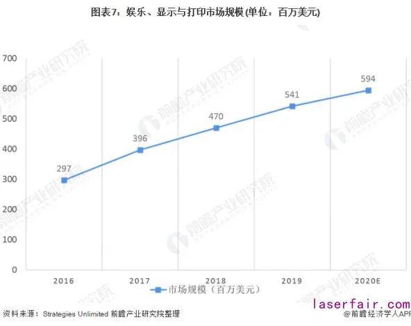娛樂、顯示與打印市場規(guī)模相對較小,僅占全球激光器總市場規(guī)模的3.2%,但在2016-2019年中一直保持增長的態(tài)勢。2020年隨著中國激光影院數(shù)量的增加以及用于電視機(jī)和投影儀激光器的增長,會對娛樂、顯示與打印市場的增長產(chǎn)生有利影響。