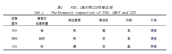 光源和成像器件是激光三角測量中兩個主要光電器件?紤]到成本、質(zhì)量以及連續(xù)發(fā)光等要求,現(xiàn)有激光三角測量系統(tǒng)主要以半導(dǎo)體激光二極管作為光源。常用成像器件有光電位置傳感器(position sensitive detector,PSD)、互補(bǔ)金屬氧化物半導(dǎo)體(complementary metal oxide semiconductor,CMOS)和電荷耦合元件(charge coupled device,CCD)。PSO、CMOS和CCD性能比較如表1所示,F(xiàn)階段主要以CMOS和CCD為主。