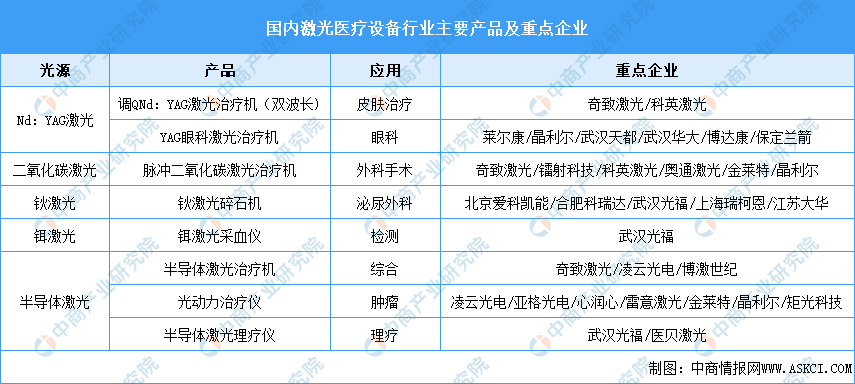 激光醫(yī)療設(shè)備國產(chǎn)化率提升,資本市場表現(xiàn)活躍目前國內(nèi)約有上百家激光醫(yī)療器械企業(yè),按綜合競爭力可分為兩大梯隊(duì)。其中,第一梯隊(duì)以外資企業(yè)和國內(nèi)少數(shù)優(yōu)勢企業(yè)為主,代表性廠商有以色列飛頓(Alma)、奇致激光、科醫(yī)人(Lumenis)和賽諾秀(Cynosure)、歐洲之星(Fotona)、賽諾龍(Syneron)、半島醫(yī)療、深圳吉斯迪、吉林科英等。第二梯隊(duì)以國內(nèi)若干小型制造企業(yè)為代表,這類企業(yè)普遍起步較晚,技術(shù)積累較少,受制于醫(yī)療器械行業(yè)本身的高門檻,其產(chǎn)品很難進(jìn)入被外資和本土優(yōu)勢企業(yè)包圍的醫(yī)院等中高端市場。從國產(chǎn)化率來看,在各類激光治療設(shè)備中,氣體激光器、Nd:YAG激光器等技術(shù)較為成熟的產(chǎn)品已經(jīng)實(shí)現(xiàn)了國產(chǎn)化,而高功率半導(dǎo)體激光醫(yī)療設(shè)備研制則相對(duì)匱乏,關(guān)鍵產(chǎn)品仍需依賴進(jìn)口。目前,已經(jīng)批量上市的國產(chǎn)醫(yī)療激光設(shè)備產(chǎn)品及典型企業(yè)如下表所示: